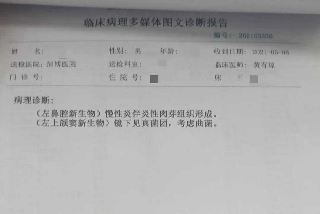 之后黃博士為魏大叔進(jìn)行了鼻內(nèi)鏡下雙側(cè)副鼻竇開放術(shù)(上頜竇、篩竇)+左側(cè)上頜竇真菌團(tuán)塊取出,病檢結(jié)果為:(曲菌)真菌性鼻竇炎。